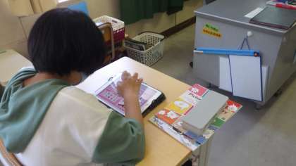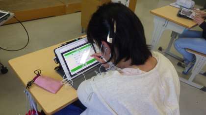 本年度、高学年は外国語科のデジタル教科書を学習用タブレットで使うことが出来ます。ALTの先生からネイティブの発音が聞けない授業では、タブレットから流れる音声を聞きながら発音練習をしています。