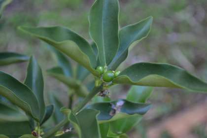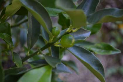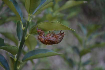 1年生が植えたキンカンに実がなり始めました。葉には白い卵のようなものが付いていましたが、何の卵でしょうか。そしてセミの抜け殻も…。いろいろな生き物がキンカンの木を利用しています。