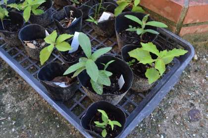 2024年秋にオープン予定の豊田市博物館の敷地内に、ドングリの森をつくるということで、ドングリの苗木を育てるプロジェクトに5年生が取り組んでいます。4年生のときに地域の里山から、コナラ、アラカシなどのドングリを拾い集め、ポットで育てています。今年の春になってやっと芽が出ましたが、夏の暑さにだんだん数が少なくなり、夏休みに入る前には8本になってしまいました。このあと暑い夏を乗り切り、鷹見の里の寒い寒い冬を越さないといけません。このままだと、残るのは半分の4本ぐらいかなという感じです。9月に入ったら、5年生で今後のことを相談しなければいけません。