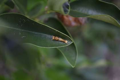 8月2日、1年生がビオトープに植えたキンカンの葉に、幼虫がいました。何の幼虫でしょうか。1年生のみなさん、調べて教えてください。
