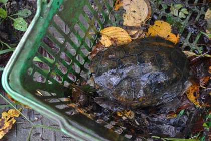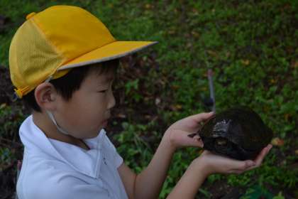 9月2日(金)朝、環境委員のビオトープ点検と整備のときに、イシガメを発見しました。落ち葉が入らないように水路に設置してあるかごを上げると、何とかごの中にカメがいました。そのままではかわいそうなので、池の広いところに移動しました。