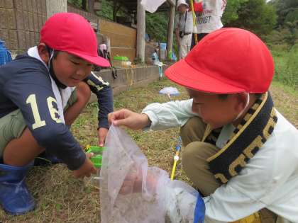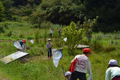 9月6日(火)、4年生がビオトープで、今年2回目のトンボ調査を行いました。講師の大内さんにあいさつをしたあと、ビオトープ内に分かれて、トンボの捕獲を始めました。トンボはたくさん飛んでいたのですが、なかなか草に止まってくれず、捕まえるのにみんな苦労しました。今回の調査で確認したトンボは、10種73頭でした。前回の調査までの確認種は19種。今回新たにショウジョウトンボ、オオイトトンボ、ミルンヤンマの3種を加え、確認種は22種になりました。