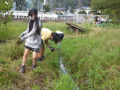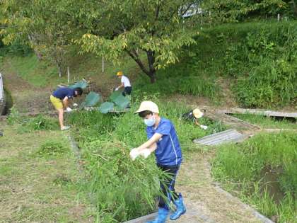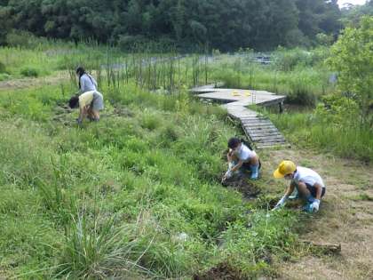 9月5日の委員会の時間に、環境委員がビオトープの整備活動を行いました。外来種を中心に、増えすぎた野草を、草刈り鎌を使って刈り取りました。特にアレチヌスビトハギの実は、トンボのはねが付いてしまうため、トンボの脅威です。短い時間でしたが、みんな一生懸命作業をしましたので、トンボも喜んでいると思います。