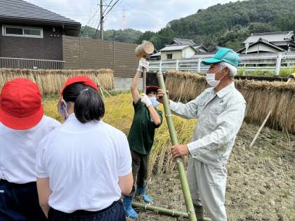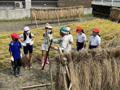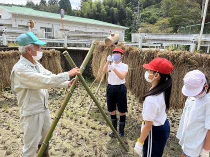 9月15日(木)、校内整備員の三宅幸夫さんに教えていただき、5年生がはざを作りました。明日はいよいよ、楽しみにしていた稲刈りです。4・5年生で協力して稲を刈り、今日作ったはざにかけます。