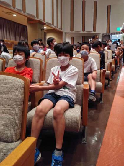 全校児童が、生の演劇の音や動きの迫力、話の展開に引き込まれ、楽しい時間を過ごしました。