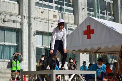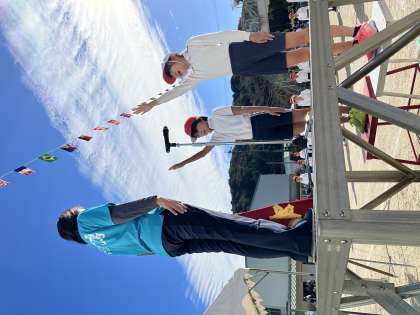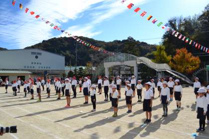 秋晴れの下、上鷹見小学校の運動会が開催されました。本年度スローガン「全力と笑顔で結ぶワンチーム」をめあてにがんばります。