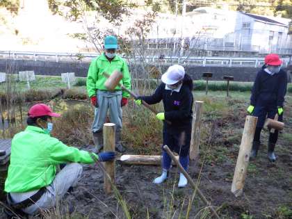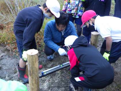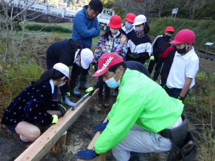 11月9日(水)、5年生が池の橋の改修を行いました。先日、ビオトープ内にイノシシが入り、池の橋を壊してしまいました。ビオトープを安全に利用するために早く改修したいと思っていたところ、5年生が快く引き受けてくれました。木工の先生として、三浦要二さんにお越しいただき。いろいろ教えていただきながら作業を進めました。慣れない道具を使っての力仕事で苦戦しましたが、なんと1時間ほどで完成することができました。5年生パワーはすごい!来週、もう1つ橋を改修する予定です。