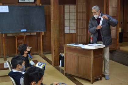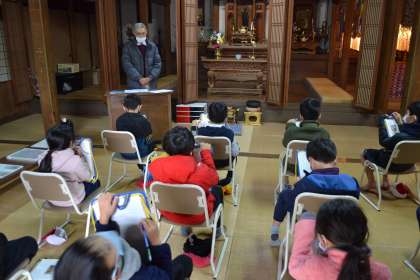 12月22日(木)に、2年生が生活科の「町探検」で、成合町の子安地蔵尊の見学に行きました。雨の中でしたが、30分ほどの道のりをがんばって歩きました。本堂では、講師の森昭二さんから、子安地蔵尊について、丁寧に、分かりやすくお話をしていただきました。特に子安地蔵尊にまつわる言い伝えについては、とても興味深いお話でした。たくさんお話をお聞きし、とても勉強になりました。またひとつ「地域の宝物」を発見することができました。森さん、ありがとうございました。
