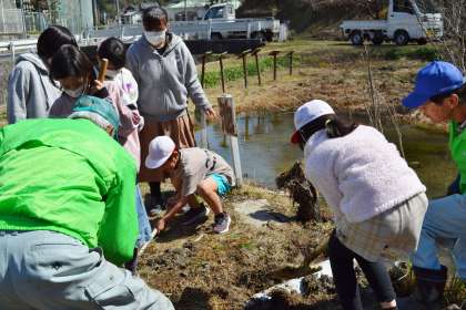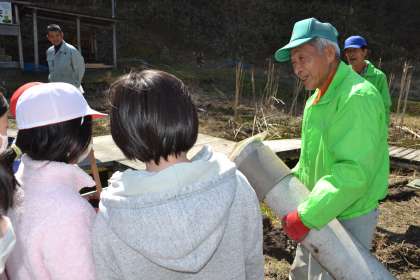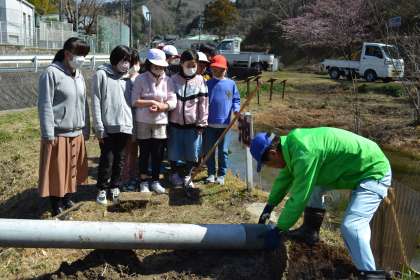 4年生は総合的な学習で、アカネ属のトンボの生息場所を増やすために、ビオトープ内に田んぼを作っています。3月16日(木)は、どきどき池から田んぼに水を取り入れるための取水管を取り付けました。取水管は地域講師の三浦要二さんお手製で、取り付けは校内整備員の三宅幸夫さんにもお手伝いいただきました。4年生も取り付け作業の様子を見学させてもらい、取水管を埋め込む最後の作業は、いっしょに行うことができました。5年生になったらすぐに田んぼづくりに取り掛かり、全校田植えに合わせて、ビオトープ内の田んぼにも田植えをする予定です。4年生の取組は、まだまだ続きます。