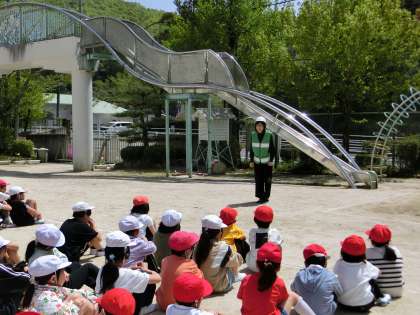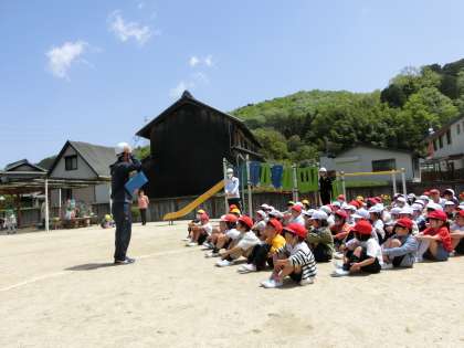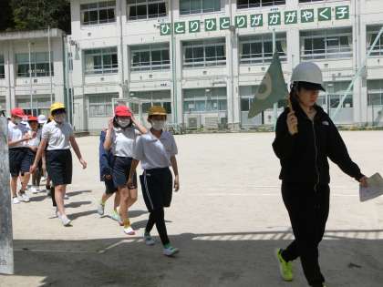 地震と火災が発生、土砂災害も起こることをを想定した避難の仕方を学習しました。子どもたちは、教室から校庭、そして上鷹見こおも園へ迅速・冷静に避難することができました。