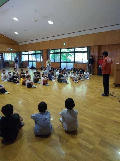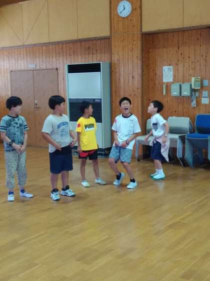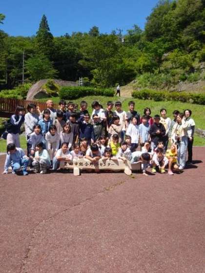 5月29日水曜日、天候に恵まれ、5年生の六所山での野外活動(キャンプ)が始まりました。石野連合3校の記念写真でスタートし、入所式、ゲーム大会が順調に進んでいます。