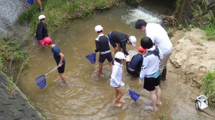 6月25日(火)、3・4年生が講師に阿部夏丸様をお迎えして、学校の前の一ノ瀬川で生き物を捕まえ観察をしました。魚やカニ、ヨシノボリなど身近な川に生き物たちがいっぱい生きていることを体感しました。