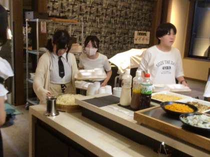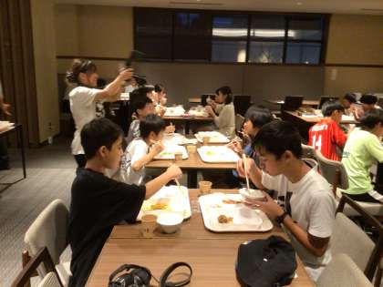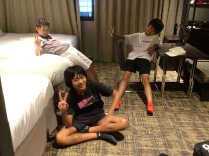 バスで京都に移動し、ホテルに到着しました。たくさん歩いたので、泊まる部屋に入って一休みでき、ほっとしたようでした。お腹も空き、お楽しみのバイキングの夕食では、好きなものをもりもり食べました。