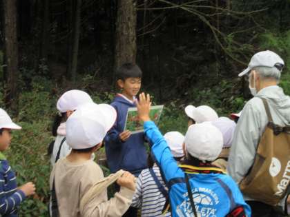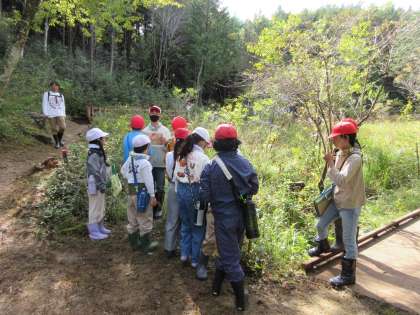 ガイド役の6年生がポイントに立ち、湿地の植物や生物について紹介しました。上高湿地を守る会の方々にも安全面でサポートをしていただきながら行うことができました。