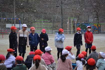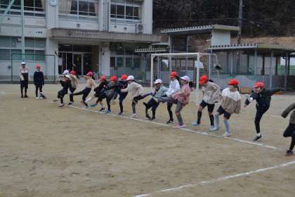 2月7日 雪の舞う中、体育・健康委員会の主催で「くつとばしギネス」を行いました。元気に足を振り上げ、学年ごとに靴のとんだ距離を競いました。