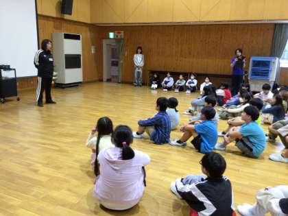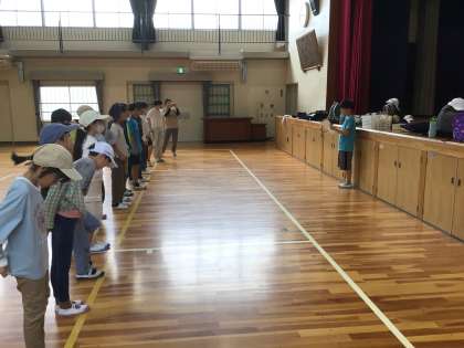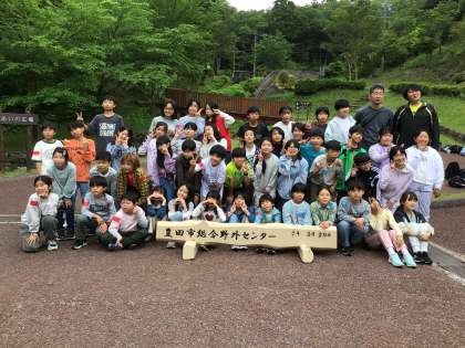 5月28日(木)、5年生が、総合野外センターでの石野連合キャンプ1日目を迎えました。出発式、貸切バスでの移動、到着してからの入所式が終わりました。上鷹見の児童は、堂々とした司会や誓いの言葉で活躍しました。