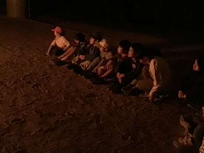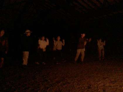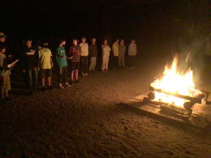 19時から、キャンプファイヤーをしました。雨が降りそうだったので、雨天ファイヤー場で行いました。火の神たちの点火で厳かにはじまりましたが、各学校の出し物のゲーム、クイズ、ダンスで盛り上がりました。3校の友情が深まりました。