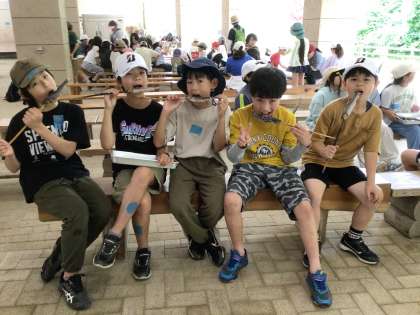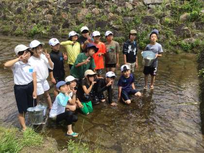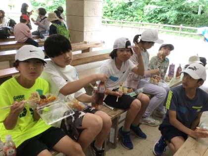 炭火で焼いたイワナをおいしくいただきました。食堂のおにぎり弁当も食べました。食べてすぐ沢遊びを楽しんでいました。みんな元気です。この後、退所式を行い、バスで帰路に着きます。