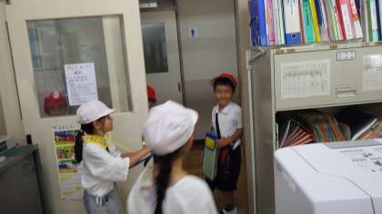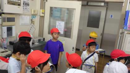 5月29日 生活科の学習で、1,2年生が「学校探検」をしました。2年生が、1年生に校舎内を案内や説明をして回りました。