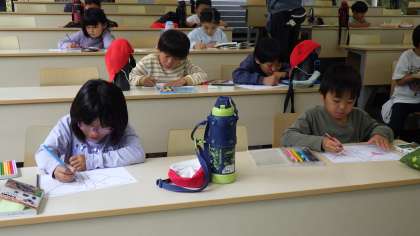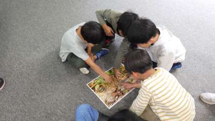 6月3日 自然観察の森へ行きました。雨天のため、森へ出ての観察はできませんでしたがが、標本を使って、バッタを観察してきました。周りの環境に溶け込む体の色をした昆虫たちのことを知りました。最後は、各自でひらひらととぶチョウの羽をデザインして色塗りしました。