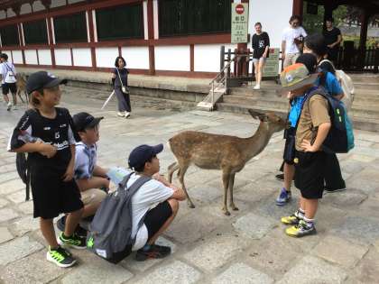 奈良公園に着きました。東大寺の大仏の大きさに圧倒されました。その後、奈良公園を班別で散策・見学しました。たくさんの鹿に出あい、こわそうにしていましたが、だんだん慣れて撫でで親しむ姿も見られました。最後、雨が降ってきて、予定を変更した班もありました。