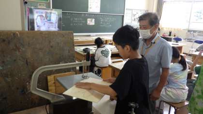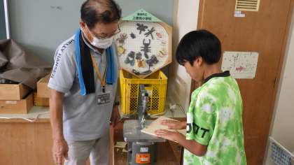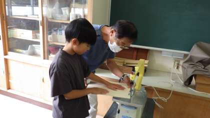 5年生は、図画工作で糸のこを使って、「伝言ボード」を制作しています。9月11日の授業では、鷹見サポート会 学習(糸のこ)ボランティアの方に見守っていただきながら、糸のこを使ってボードを自分がデザインした形に切る作業を行いました。