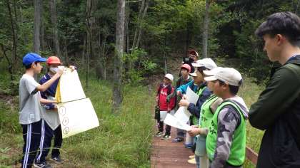 それぞれの学校の児童が、調べたり学んだりしてきた湿地の植物や生き物のことを、恩真寺湿地を則定小、矢並湿地を矢並小、上高湿地を上鷹見小の児童が紹介しました。