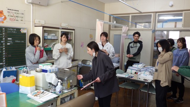 新学期を迎える前に、初期対応の迅速化と安全な環境管理のために、保健室の使い方や必要物品の場所の確認をしました。今年は、嘔吐発生時の感染拡大を防ぐために、役割分担によるロールプレイを行いました。職員一同、児童の健康と安全を守るために、研修を重ねます。