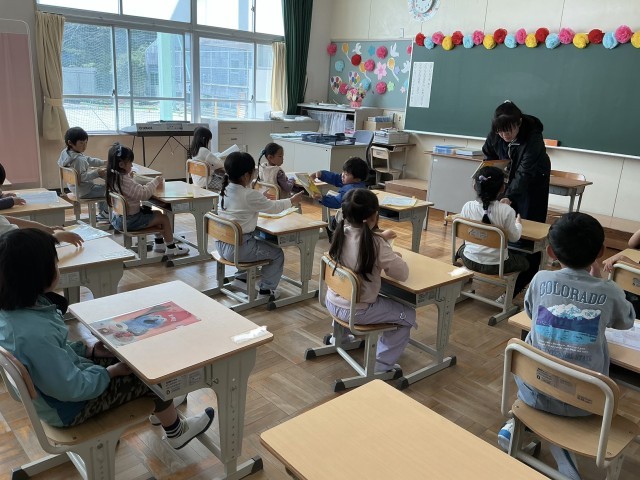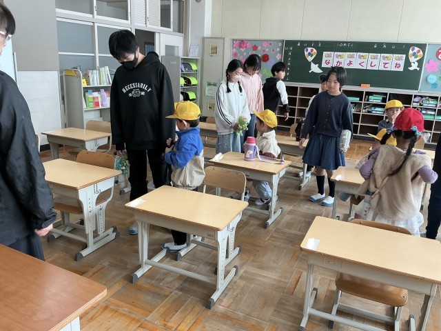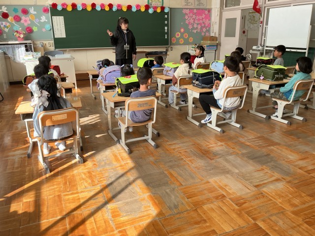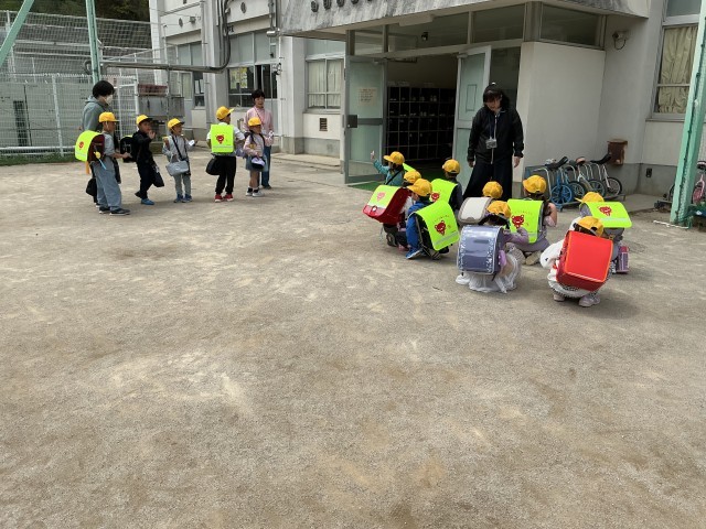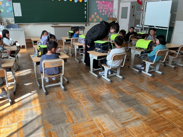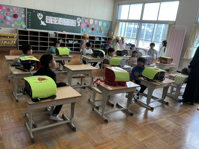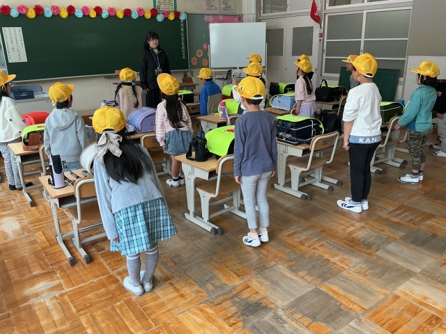長い一日が終わりました。「まだ帰らないの」「おなかすいた」と言いながらも、3時間授業を受けました。朝の準備をしたりプリントを後ろの子に渡したり、ランドセルを片づけたり上級生と一緒に通学団会に参加したり。最後は名前と好きな色を言って自己紹介。やっと帰りのあいさつをして下校しました。