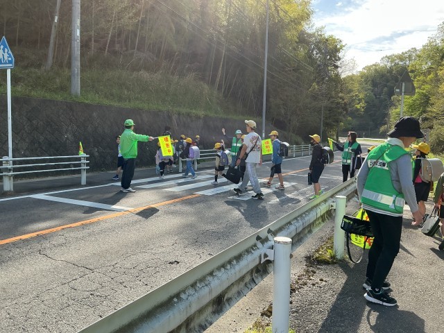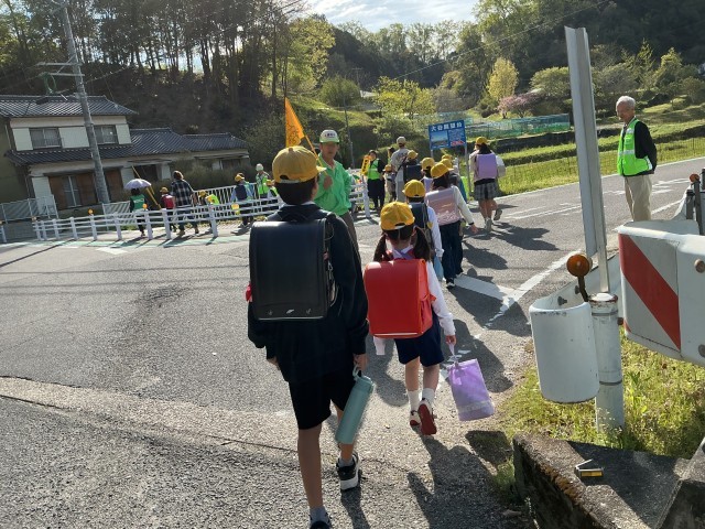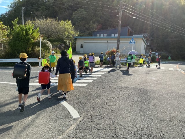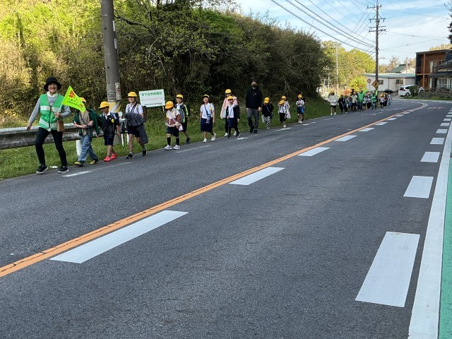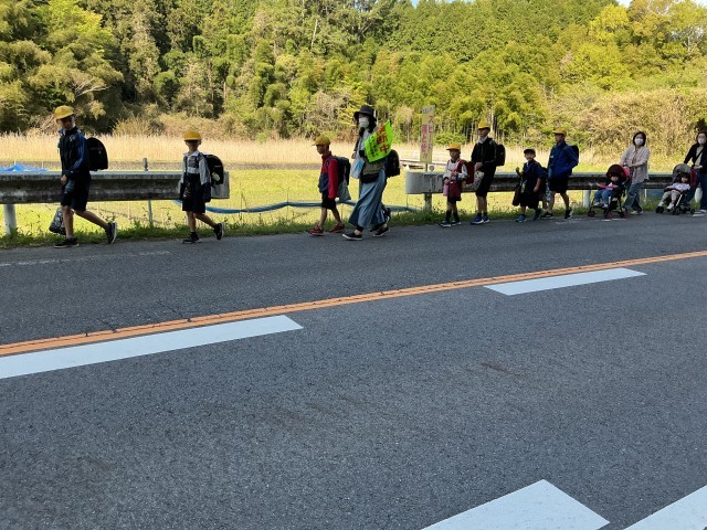 長い距離を歩いてくる子どもたち。緑レンジャーさんや地域の方、保護者に見守られて、安全に登校しています。毎朝、本当にありがとうございます。車がスピードを出す道路なので、きちんと一列で登校しましょう。