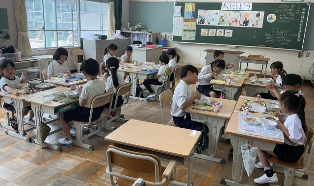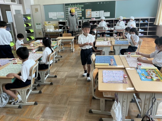 小学校初めての給食。準備や当番活動、片付けの仕方を先生から聞いて、てきぱきとすることができました。