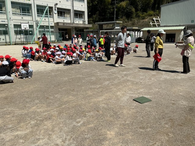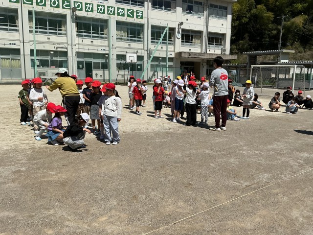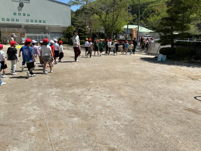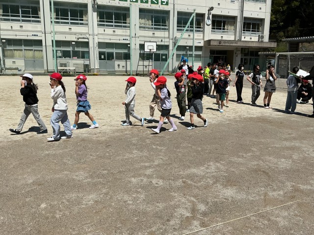 地震から火事が起こった設定と地震で山崩れが起こりそうだという設定で、避難訓練を行いました。火事の時には口や鼻をハンカチでふさぎ「おはしも」を守って静かに非難することができました。その後、こども園に移動して、保護者のお迎えを待つ訓練をしました。安全担当の教員から、非常時に自分の命を守ることができるようにという話を聞きました。