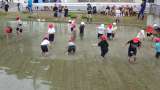 3,4年生は、田んぼの真ん中まで入り、向こうとこちらに向かいながら田んぼの端に向...