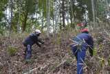 野草の春の芽生えに備えて、6年生がわくわく山のササ刈りをしました。強風が吹く、...