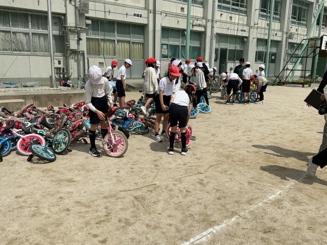 本校では全校で一輪車の練習をします。全員自分の一輪車を選び、名前を張り替えました...