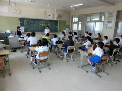 5の1は、学級の組織を話し合っているのかな。 5の2は、新品のテキストを配付し、記名中。