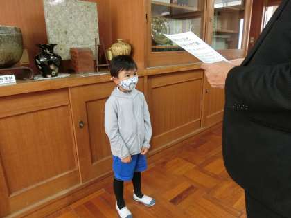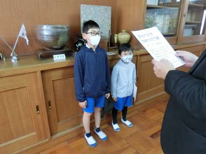 4月20日 その1 公開日 2022/04/20 更新日 2022/04/20 校長室から 今年度初「自分大好き加納大好きで賞」を渡しました。 去年の「加納賞」なのですが、ネーミングを変えました。 がんばりや善行をプリントに累積していき、30個たまったら表彰です。 2回目、3回目の賞状もあります。 校長 特別支援学級