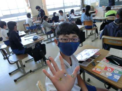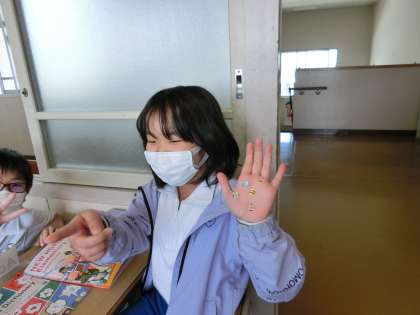 5の1の英語です。 がんばったからシールもらったよ。 手のひらには、ご褒美シール。