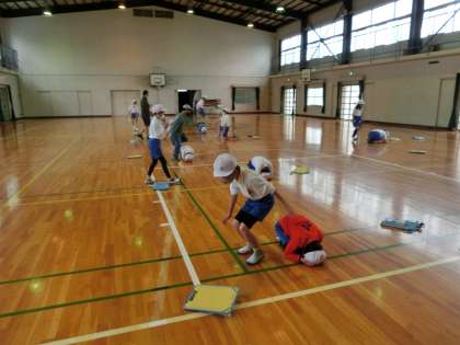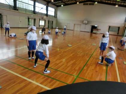 4の2 体育です。 マット運動に入る前です。 体ほぐしの運動です。