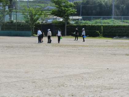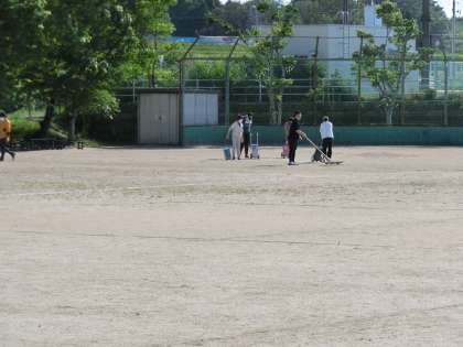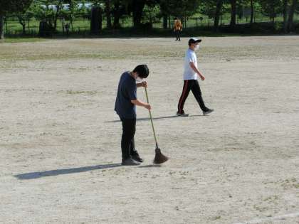 下校後、運動場で先生たちが作業をしています。