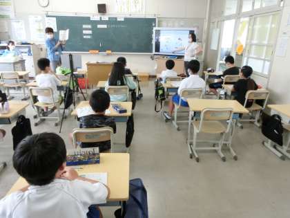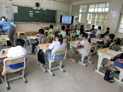 アリーン先生が英語で言ったものを聞き取り、教科書の絵をさします。
