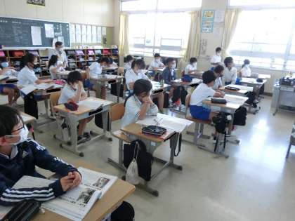 5の2 国語です。 新聞記事を読み比べよう。 写真があるとどんな効果があるのかな。