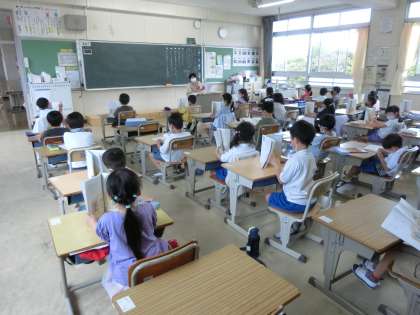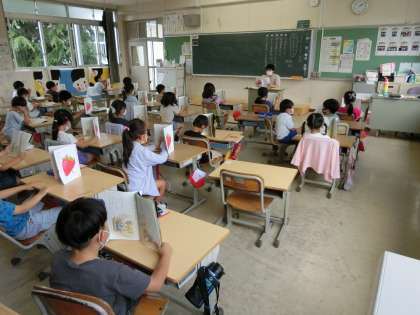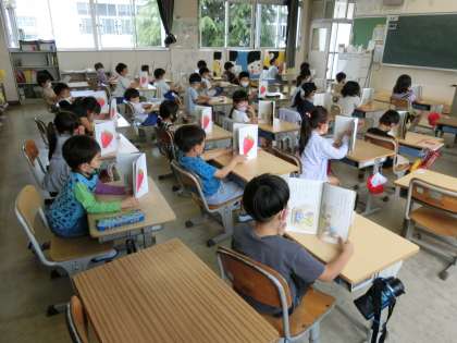 1の1 国語です。 「とんとことん」 まず、先生が読むからね、よく聞いていてね。