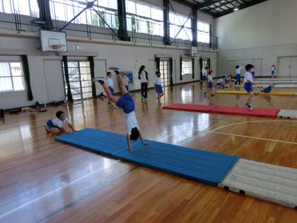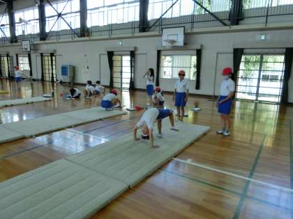 4の1 体育です。 マット運動。3つの連続技に挑戦中です。 上手だよ。もっと磨き上げられるかな。