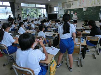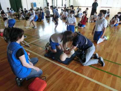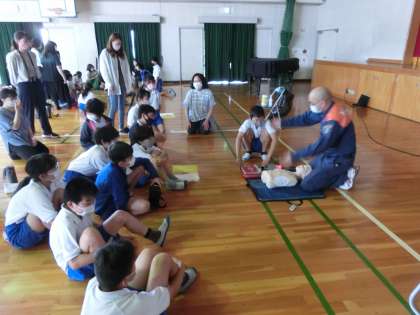 6月10日 その7 公開日 2022/06/13 更新日 2022/06/13 校長室から 授業参観 その5 第2校時に、PTAによる救命救急講習を行いました。 心肺蘇生、AEDを6年生と保護者(希望者)で行いました。 AEDは、使い方に自信がなくても全然大丈夫! ボックスを開いて、電源を入れだけ。 あとは、勝手に指示をしてくれます。 指示通りにやるだけです。 校長 6年 特別支援学級 PTA