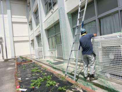 6月13日 その3 公開日 2022/06/13 更新日 2022/06/13 校長室から 4年生の畑です。ゴーヤが育っています。 公務手の河田さんと校内整備員の福本さんが設置してくれました。 今年も緑のカーテンができます。 校長