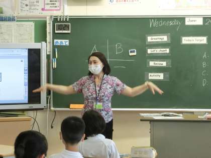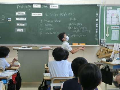 6の1 英語です。 ゼスチャーで物事を表現しています。 何かな。 正解!