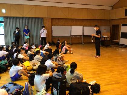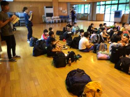 5年キャンプ 六所に着いたぞ! 入所式です よろしくお願いします。