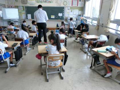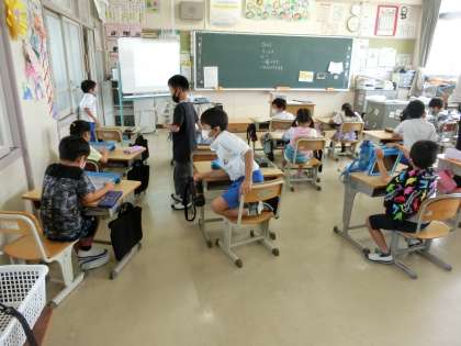 7月20日 その2 公開日 2022/07/20 更新日 2022/07/20 校長室から 2の1 養護教諭の先生からの「姿勢アンケート」に答えています。 タブレットを使って一人一人頑張っていますが、ちょっと難しい。 教務主任も助けに来てくれました。 校長 2年
