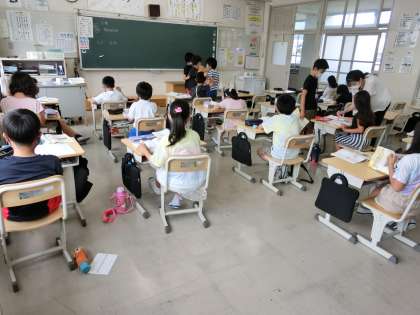 4の1 算数です。 練習問題を各自進めています。 「できた人から、先生が答え合わせをします」